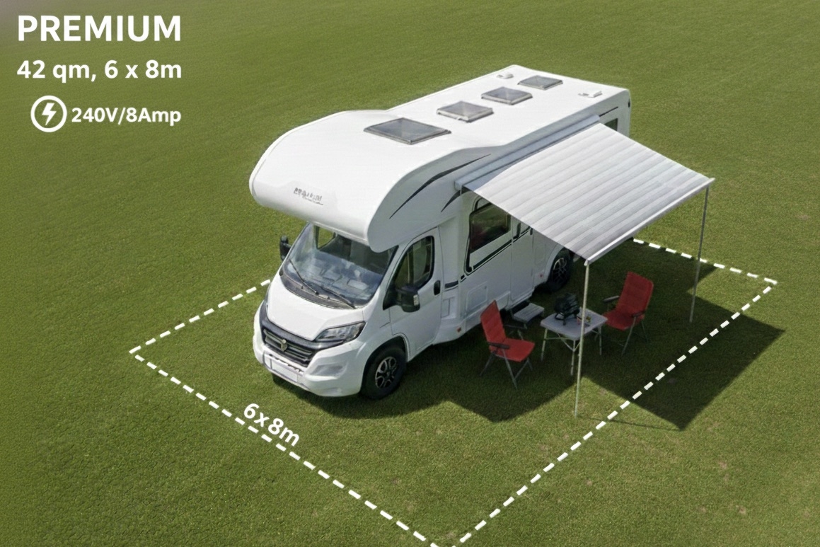 Posto PREMIUM (circa 48 m²): L'opzione comfort per grandi camper (fino a 7,5 m) su prato pianeggiante. L'elettricità (230V) con 8 Amp garantiti è inclusa nel prezzo. (Molti altri campeggi forniscono spesso solo 1,5-3 Amp)