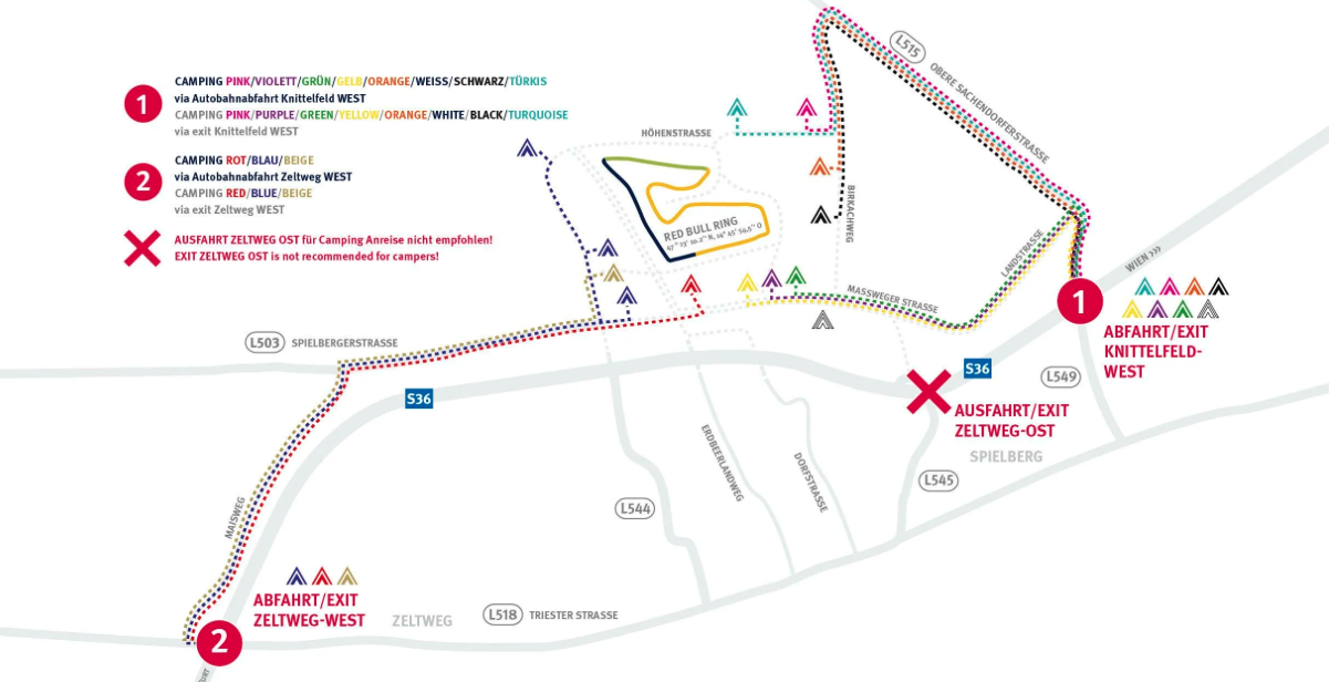 Intorno all'anello ci sono vari campeggi per gli ospiti che non hanno problemi con il rumore e le notti di festa. Questi sono elencati sul sito web del RedBull-Ring. Per prenotare e conoscere i prezzi più aggiornati e legati agli eventi, è consigliabile visitare i siti web dei rispettivi campeggi, poiché i prezzi variano a seconda dell'evento. È possibile confrontare le varie opzioni e in alcuni casi prenotare online. Una buona scelta è anche su www.f1austria-camping.com o su www.motogpaustria-camping.com per informazioni. Questi siti web descrivono e indicano il campeggio più popolare ed economico presso il RedBullRing a Spielberg.