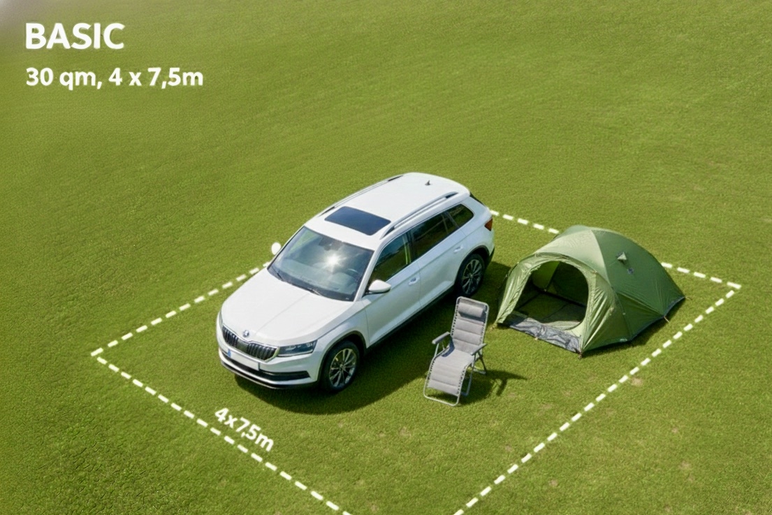 Posto BASIC (circa 30 m²): Ideale per viaggiatori individuali con auto e tenda, camper (fino a 6 m) o motociclisti. L'elettricità è disponibile su base opzionale.